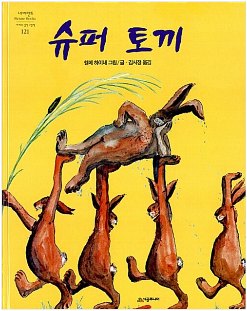 『슈퍼 토끼』(Der Superhase)는 약간 우울한 책입니다. 헬메 하이네는 이 책에서 부질없는 욕망과 어리석은 대중의 속성을 표현했다. 토끼 한스는 유명해지고 싶어서 새처럼 날아 보려고 나무에서 뛰어내린다거나 헤엄을 쳐 보겠다고 물에 뛰어드는 행동 덕에 ‘슈퍼 토끼’라는 별명을 얻는다. 한스의 욕망을 응원해 주느라 뒤에서 앞발로 눈을 일제히 가리고 진실을 보지 못하며 장단 맞춰 주는 어리석은 토끼 무리나 남들이 자기를 한눈에 알아볼 수 있도록 귀를 묶는 바람에 여우가 다가오는 소리도 못 듣고 잡아먹히는 한스를 보며, 불안감이 느낀다. 저마다 자기 알이 가장 아름답다고 여기는 닭들의 경쟁을 통해 다양성의 아름다움을 알게 되는 이야기이다.