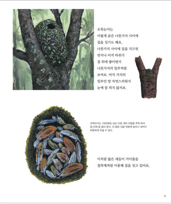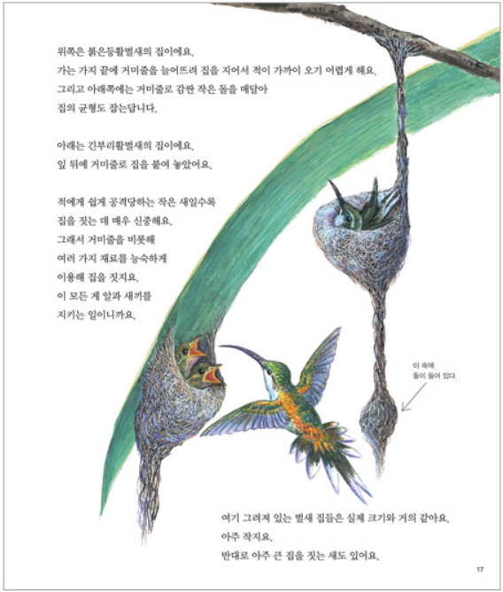 특히 이 도서는 전문성을 갖춘 작가가 그림까지 소화한 대작이다. 동남아시아나 남아메리카, 아프리카처럼 우리나라와는 기온이나 환경이 다른 지역에서만 볼 수 있는 희귀한 새와 새집을 직접 관찰하면서 그렸기 때문에 내용과 그림의 완성도가 아주 높다.