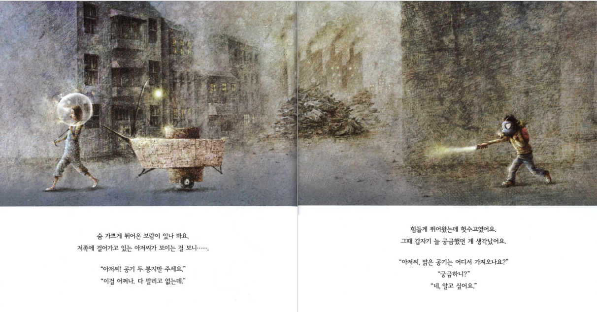 아름다운 세상을 만나는 신기한 경험을 하게 된 주인공은 깨끗한 공기를 조금씩 담아 온다.