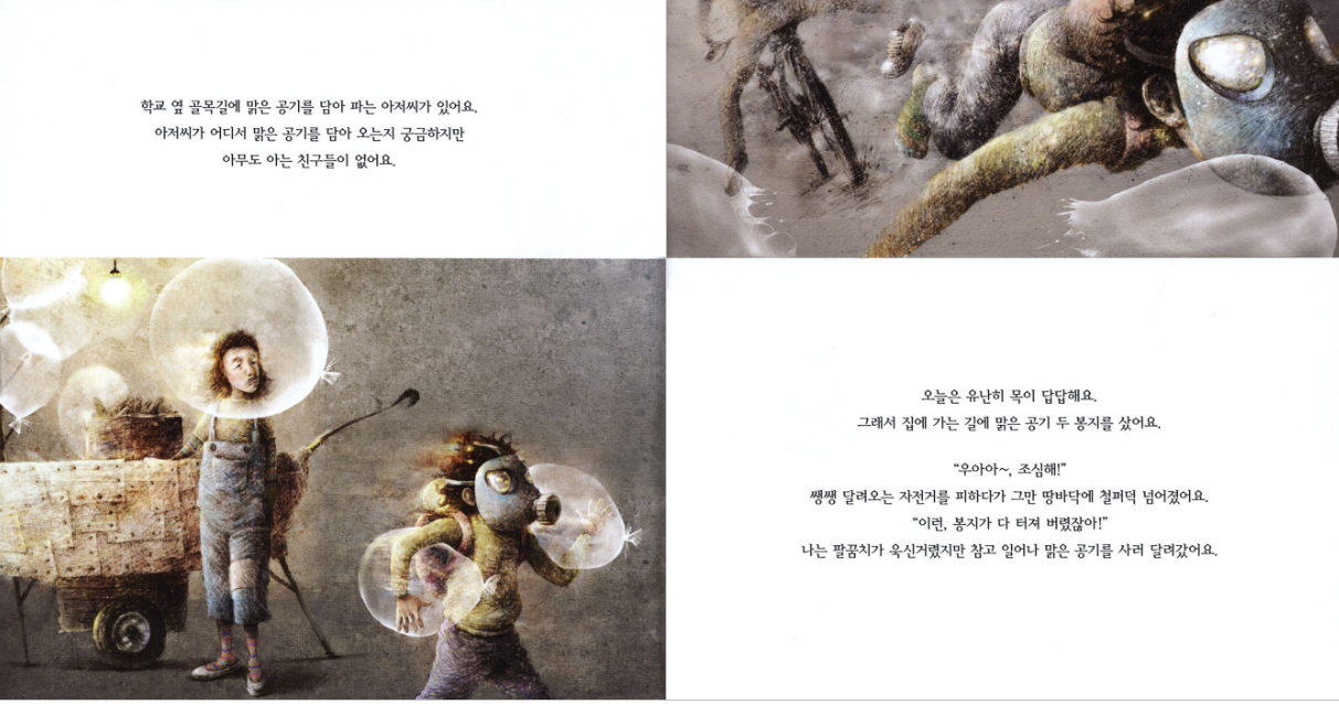 아름다운 세상을 만나는 신기한 경험을 하게 된 주인공은 깨끗한 공기를 조금씩 담아 온다.