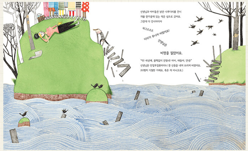 그러던 어느 날, 선생님이 아이들을 데리고 개울 한가운데 있는 작은 섬으로 소풍을 갔어요.