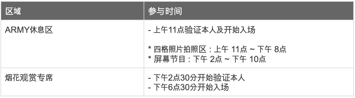 有关‘ARMY休息区'和 ‘烟花观赏专席' 入场的报名及抽签等详细介绍,请参考将于6月8日(周四)下午3时(KST)发布的BTS Weverse公告。