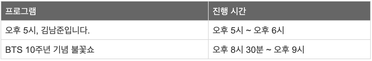 *우천 예보 시 행사 일정 및 내용이 변경될 수 있으며, 변동 사항 발생 시 BTS 위버스 공지 및 BTS Official 트위터 채널을 통해 안내 드릴 예정입니다.