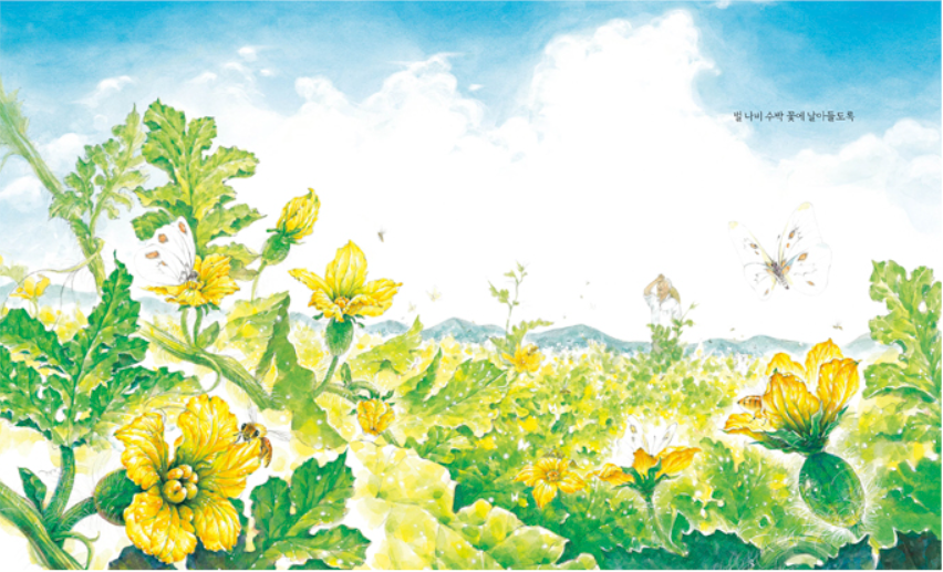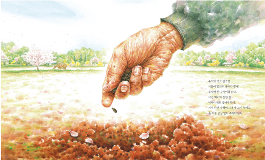 이 그림책은 농부가 수박 씨앗을 뿌리는 것부터 싹이 나고 꽃이 피고