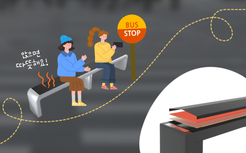 공간이 띄워져 열을 머금고 있다가 앉으면 눌러져서 따뜻해지는 원리를 가진 탄소온열벤치