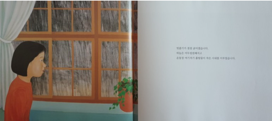 우산이 없는 아이는 비가 그치기를 기다리면서 엄마를 그리워하고,